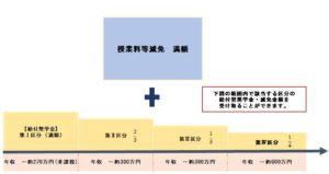 ①授業料および入学金の減免制度+②給付型奨学金の2つの支援を受けることができる制度です。